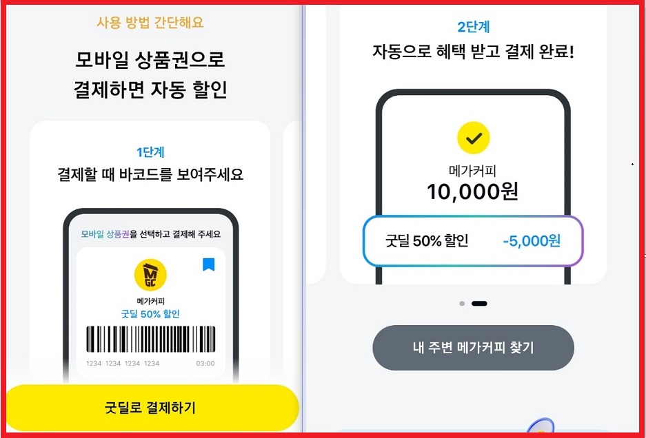 - ‘메가커피 50% 할인’ 배너 클릭 → 굿딜로 결제하기 클릭